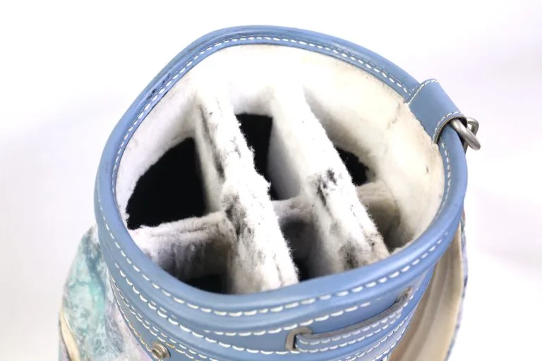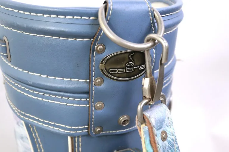 EXCELLENT – This Cobra golf bag is in Excellent condition with less than average wear from use. There is minimal dirt and staining on this bag from handling aside from some minor staining near zippers. There are also minimal signs of tearing among the dividers and near the pockets, apart from slight feathering at the top of the bag.. This bag Comes with 6 dividers and 6 pockets and features multiple zippers that all function well. Please see the pictures provided for more details.